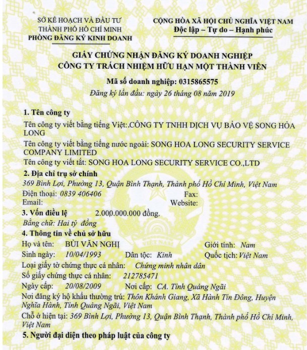 Song Hỏa Long Group có tên đầy đủ là CÔNG TY CỔ PHẦN DVBV SONG HỎA LONG GROUP, trụ sở tại 27/18/7 Nguyễn Bỉnh Khiêm, P1 , Quận Gò Vấp, Thành phố Hồ Chí Minh, mã số thuế 0317970790, giấy phép đăng ký kinh doanh số 0315865575 do Sở Kế hoạch và Đầu tư Thành phố Hồ Chí Minh cấp và giấy chứng nhận đủ điều kiện về an ninh trật tự số 2936/GCN.